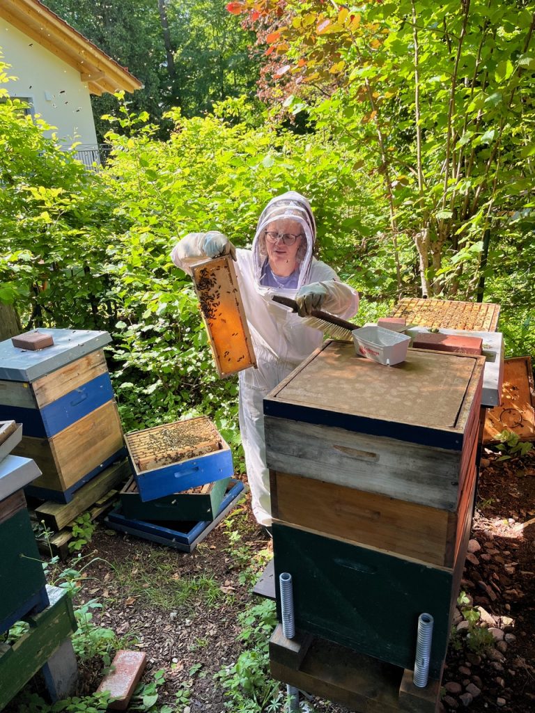 „Die Bienenvölker stehen in meinem Garten in Icking und finden hier hervorragende Trachtquellen. Der Frühjahrsblütenhonig ist cremig gerührt. Der Sommerblütenhonig ist zunächst flüssig und wird mit der Zeit fest.“ Caroline von Kospoth